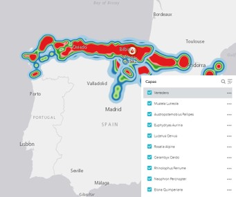 Gracias al IEET y al Ministerio de Agricultura, Alimentación y Medio Ambiente hemos podido representar las distintas especies que habitan en los alrededores y que están en peligro de extinción o en situaciones de vulnerabilidad. Se puede comprobar el área de distribución de cada especie y los colores representan la densidad de muestreos realizados para cada una.