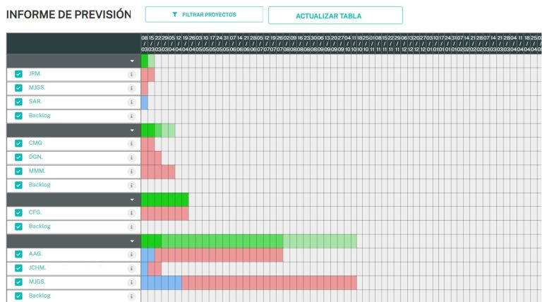 Además, con esta herramienta es posible simular la forma en la que se reparte la carga de trabajo. Por ejemplo, si se activan o desactivan los usuarios bien porque un miembro deja el equipo, bien porque se da de baja, etc. automáticamente sus tareas y el tiempo planificado para ellas se reparten de forma equitativa entre el resto del grupo.
